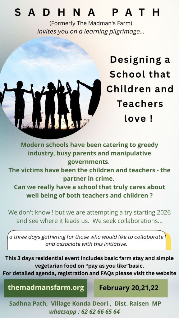 The gathering is primarily a prelude to school that is opening at Sadhna Path in April 2026. We wish to use this gathering as a platform to launch our school through common dialogues, brainstorming and experience sharing. A small group comes together and design the school. We also hope to find some mentors, volunteers, teachers, team members through this gathering.