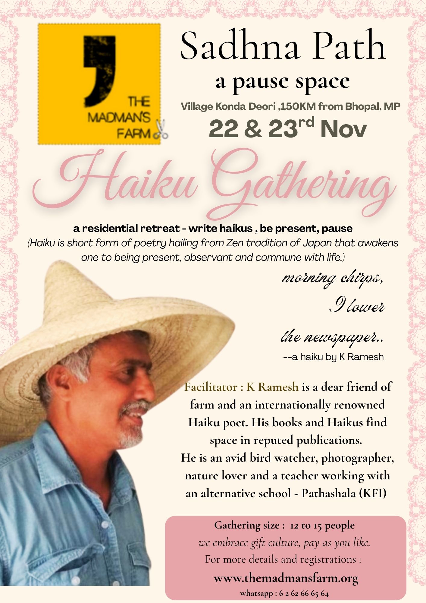 Dates : November 22nd Saturday 10 AM to 23rd Sunday 5PM – Haiku Gathering to be facilitated by K Ramesh.