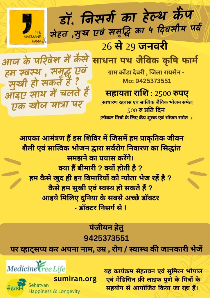 The Madman’s farm with support of Dr. Vipin Gupta and team at Sehatvan Bhopal , Dr. Praveen Choradia and team at Medicine Free Life Pune and Shri Rajesh Gupta and team at SUMIRAN bhopal – brings to you this simple yet effective healing camp.