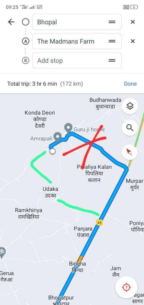 If you are planning to just Google Maps driving direction to get to farm, please note that while most part of the directions are good the last 5 KM (once Google tells you take a detour from Highway) is absolutely mistaken. If you take this route , you will have to pass through a very bad road. (No issues, if you are walking though). Instead of this, Take a road to Budhanwada at Tulsi Nagar from Deori or even better just take a road that leaves Highway right after Panjara towards Udka village , further to Konda Deori.